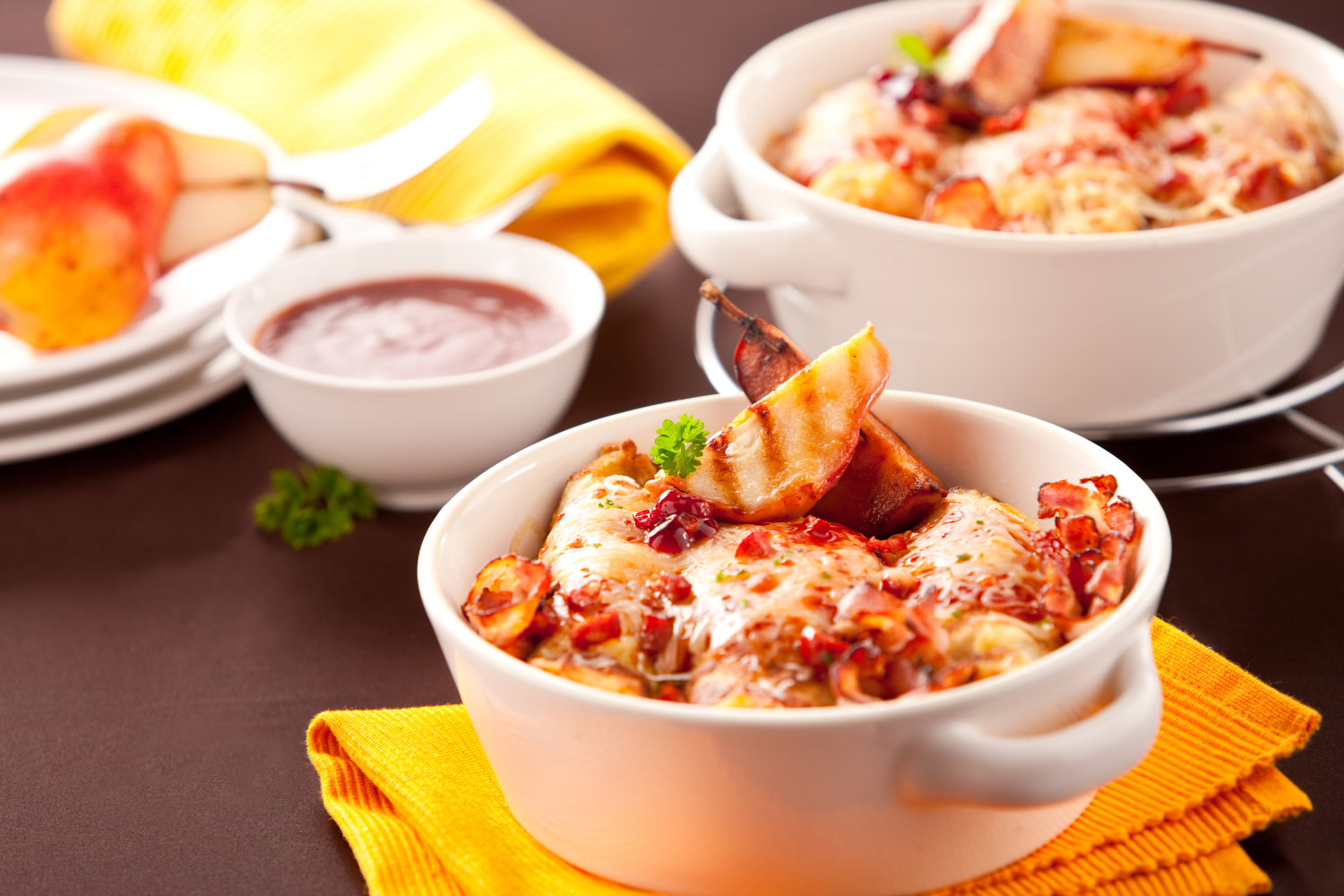 Na oleji zpěníme nadrobno nakrájenou cibuli, přidáme maso nakrájené na drobné kostičky a restujeme do poloměkka. Mistrovo uzené a Váhalovu slaninu také nakrájíme na drobno, žampiony na plátky, ořechová jádra nasekáme a vše přidáme k cibuli s masem; restujeme až je maso měkké. Osolíme dle chuti, opatrně okořeníme, zamícháme a necháme vychladnout. Palačinky naplníme směsí, stočíme je a položíme do zapékací mísy nebo na plech vyložený pečicím papírem. Před zapečením můžeme palačinky posypat nastrouhaným tvrdým sýrem. Podáváme zdobené polovinou oloupané kompotové hrušky, jeřabinami a snítkou zelené petrželky.