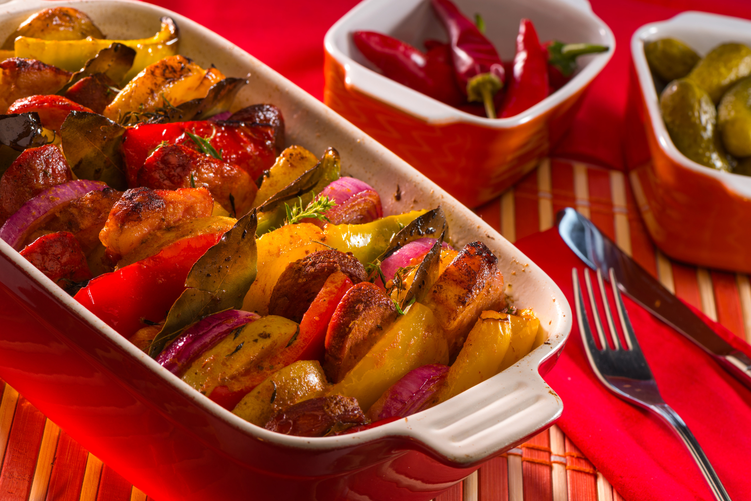 Nakrájejte na silnější plátky slaninu, na kolečka špekáčky a klobásku, cibuli nakrájejte na kolečka, žlutou i červenou papriku na oplátky, česnek oloupejte, ponechejte celé stroužky. Pekáč lehce vymažte sádlem. Do něj pak skládejte za sebou špekáčky, papriku, klobásu, cibuli, slaninu, papriku. Jestli máte rádi více zeleniny, přidejte více papriky, cibule. Takto vyložte celý plech. Vše můžete ještě lehce posypat grilovacím kořením. Živáňskou zakryjte alobalem a pečte při 200 °C asi 50 minut. Pak odstraňte alobal a dopečte dozlatova během dalších 10 minut.