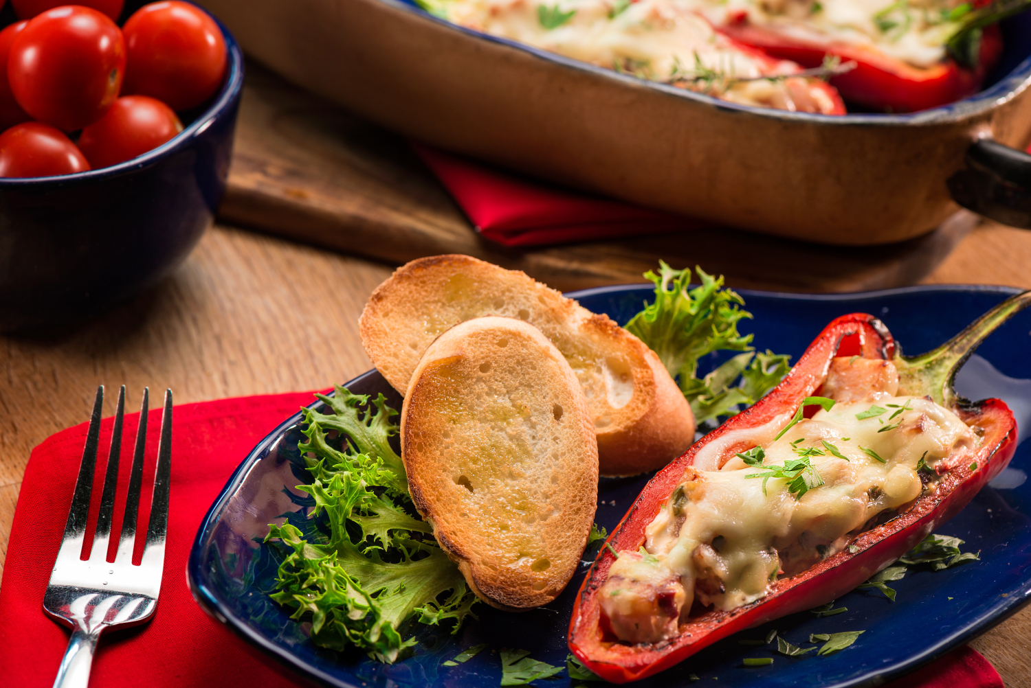 Papriky rozřízneme napůl a vybereme semínka a střed. Na kostičky nakrájenou slaninu smícháme s nastrouhaným sýrem a smetanou, aby vznikla hustá náplň. Okořeníme provensálským kořením a necháme odstát. Papriky naplníme směsí, rozložíme je na vymaštěný plech a ještě posypeme nastrouhaným sýrem. Zapékáme cca 20 minut při 180 °C, až sýr zezlátne. Podáváme s bagetou či topinkou.